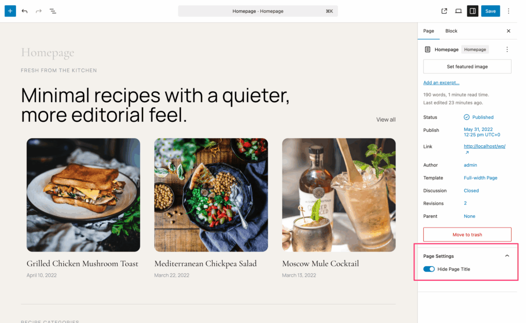 Sıkça talep edilen bir özellik — artık herhangi bir sayfanın başlığını blok düzenleyici üzerinden doğrudan gizleyebilirsiniz. Bir sayfayı düzenlerken, kenar çubuğundaki Sayfa Ayarları panelini arayın ve Sayfa Başlığını Gizle seçeneğini etkinleştirin. Başlık editörde karartılacaktır ve ön yüzeyde görünmeyecektir.